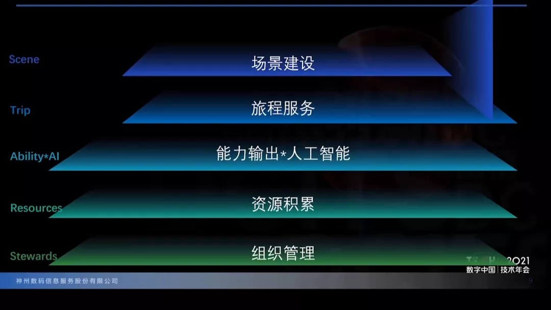 “场景建设”层是帮助拓展业务触角、提供统一交互体验、输出整体品牌形象的系统层次,一方面帮助金融企业建成“柜台服务、移动服务、远程服务与客户自助服务”相结合的线上线下融合服务模式,另一方面是依托生态链接系统体系,广泛开展跨行业合作,建立社群、农银、税银、银企、学银、供应链、交易市场等不同领域的融合场景,更好地将金融服务扎根于用户的生活生产过程当中,帮助金融机构实现场景与用户的连接,满足用户所需、赋能产业发展。“旅程服务”是ModelB@nk5.0整体架构的核心层次,由用户旅程、产品服务和资金投资三部分相关系统组成,强调按照用户在特定场景下的不同服务需求定制千人千面的流程体验及产品服务,让用户宛如在高端旅行中一般、舒服自然地享受不同内容的金融服务过程。“能力输出”层是金融企业将基础能力以集中方式向旅程服务进行输出的系统层次。由业务层面的四个中台体系,内管中台、业务服务中台、营销中台和风控中台,以及负责基础技术能力输出的三个中台体系,数据中台、技术中台以及金融超脑共同组成。金融超脑将提供整套AI能力应用,帮助业务系统和技术平台实现不同的智能化需求,释放出更强大的潜能。“资源积累”层,强调数字化经营过程中通过湖仓一体技术沉淀的数据资源,如客户数据资源、外部数据资源、政府数据资源、机构数据资源等。“资源积累”层沉淀的数据资源再通过数据中台实现数据的实时分析与传输,快速地将数据价值赋能到业务处理以及经营管理过程当中。“组织管理”层是整体架构面向金融企业监管、审计和经营管理等层面,保障金融企业平稳运行发展的根基。